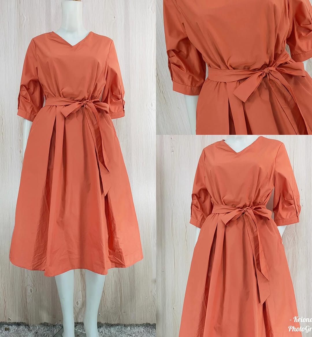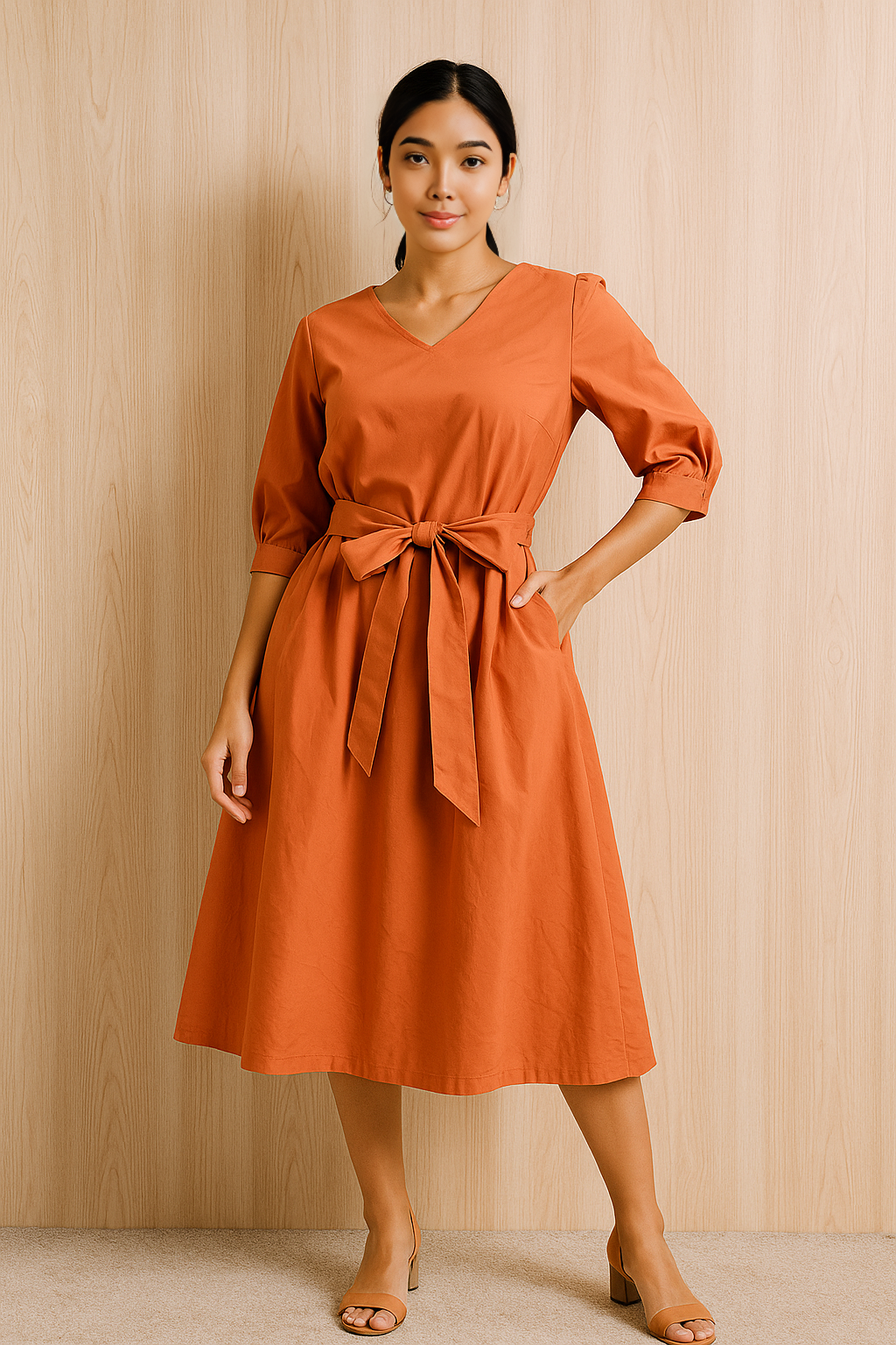The HQ Belted Cotton Midi Dress in warm rust offers breathable ease and a tie-waist silhouette for a naturally flattering finish—an elegant preloved piece.