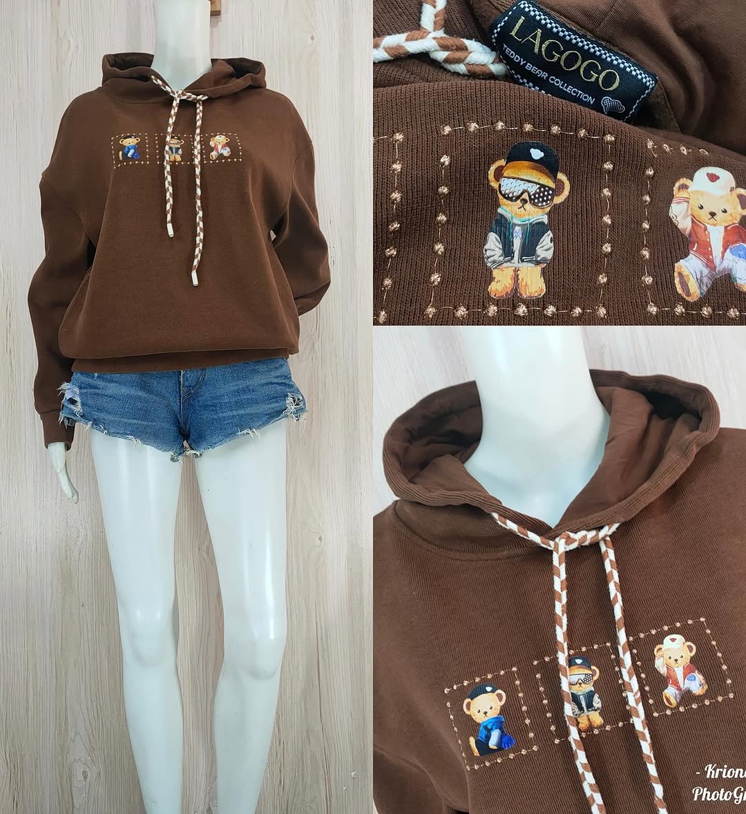 La go go pullover hoodie with bear graphic panels and striped drawcords—casual, warm, and easy to style with denim or skirts. A preloved staple with character.