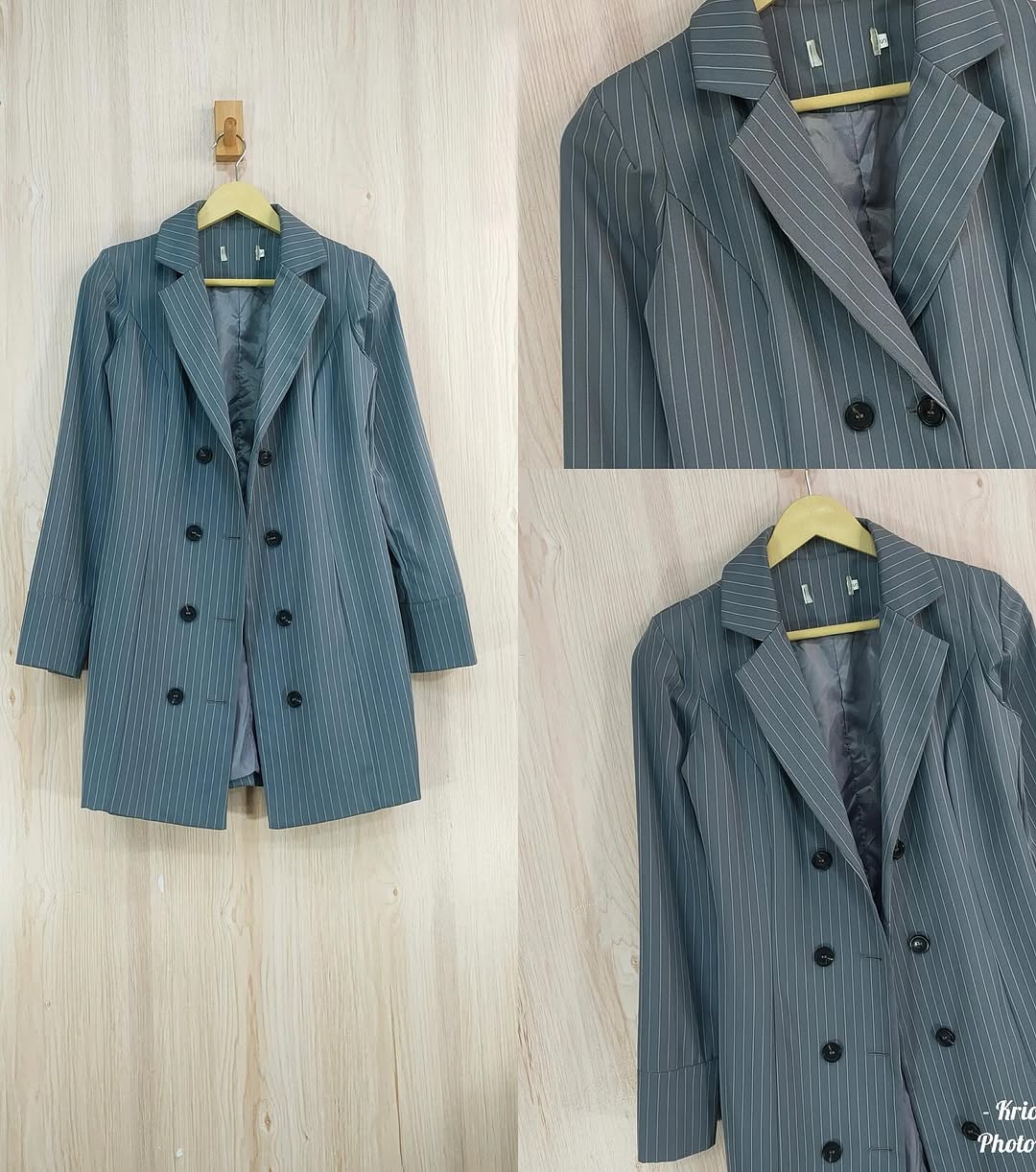Tailored longline blazer in charcoal pinstripes with structured shoulders and a smooth drape. A preloved layer that moves from desk to dinner with ease.