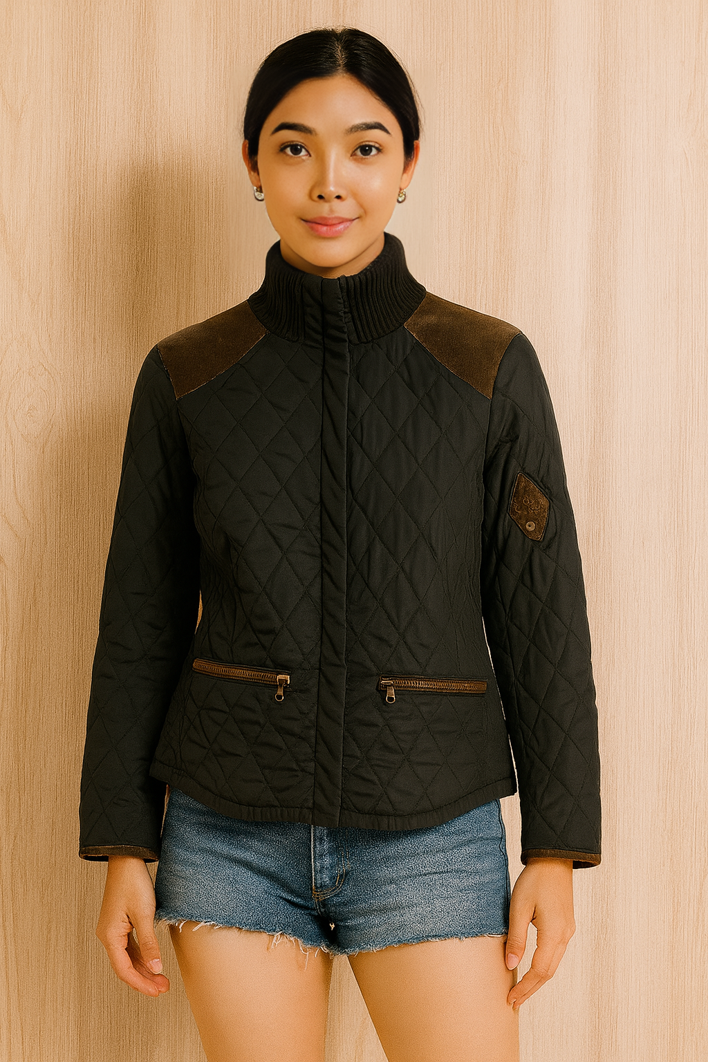 Zara quilted field jacket with ribbed stand collar, suede‑look shoulder panels, and zip pockets—functional yet refined. A gently‑loved piece that adds warmth without bulk.