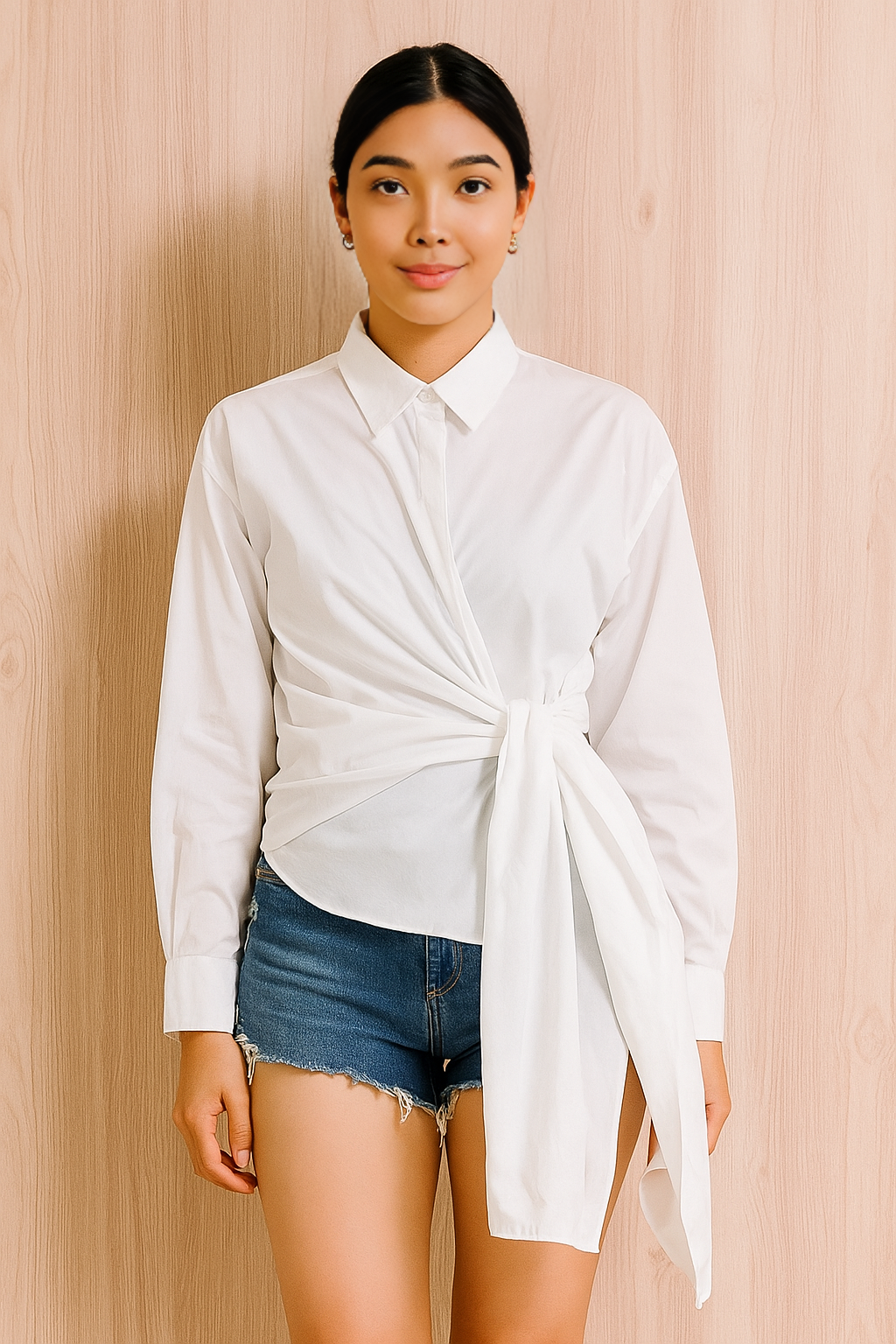 The Zara Side‑Tie Wrap Shirt in white sculpts the waist with a draped tie and clean collar—an elegant preloved piece that upgrades everyday tailoring.
